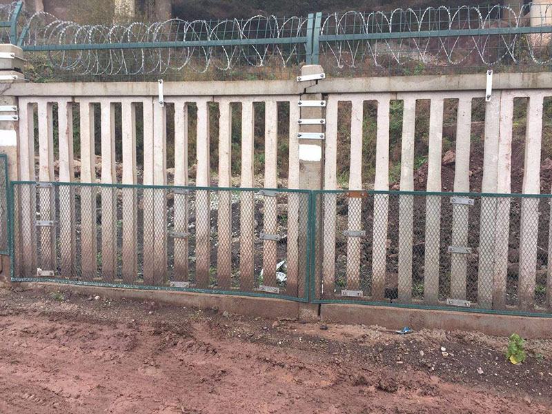 鋼筋混凝土立柱金屬網(wǎng)片防護(hù)柵欄由立柱、網(wǎng)片及連接部件組成,防護(hù)高度1.8m。根據(jù)國(guó)家要求,安平縣帝順絲網(wǎng)有限公司特生產(chǎn)有通線2012-8001和通線2012-8002兩種國(guó)標(biāo)產(chǎn)品,為鐵路線路提供安全防護(hù)。